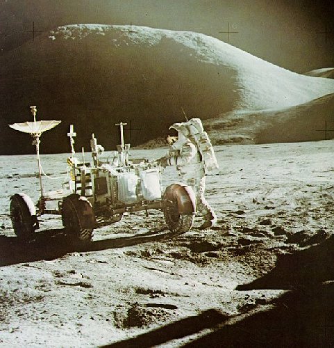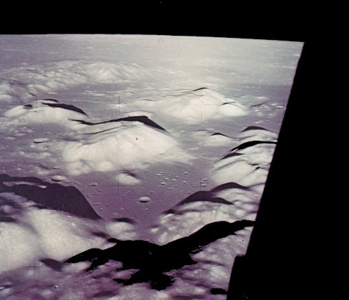 | Comparable to the Grand Canyon in scale and grandeur, the Valley of Taurus-Littrow extends some 20 miles through the ring of massifs surrounding the plains of the Serenitatis basin. In this westward-looking view from Apollo 17 LM Challenger, CSM America is the small central speck below and ahead, approaching the neck of the valley between the 1 1/2 mile high massifs. |