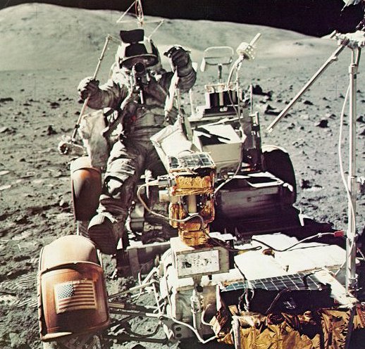| The television camera on the Rover, which could be remotely controlled from Earth during traverse stops, was the eye of the science team. It gave them much of the information needed to radio advice up to us. |