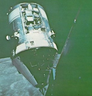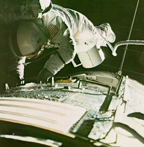 | Adrift between the Earth and the Moon, Ron Evans retrieved the film canister of the mapping cameras on the day after Apollo 17 left lunar orbit. His space walk lasted an hour, and resulted in the successful retrieval of data from three experiments. Ron's oxygen was fed from the spacecraft through the umbilical hose, with an emergency supply on his back. I was in the open hatch to help in retrieval, which was necessary because the service module would be jettisoned before we reentered the Earth's atmosphere. |