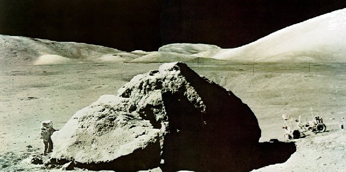 | A panorama of lunar history is captured in this view looking south over the Valley of TaurusLittrow. A huge fragmented boulder had rolled almost a mile down the side of the North Massif to here, Station 6 on our traverse (see here). Our LM and its light area of surface alteration can be seen on the photo about an inch to the right of the top point of the boulder. That's me at the left. Note the marks of my sampling scoop on the debris resting on a slanting surface of the boulder at left. Gene Cernan took the photos from which this mosaic was assembled. |
