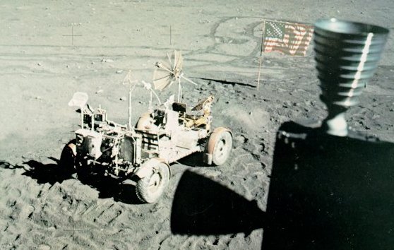 | A parked Rover awaits our return from sleep before we set out on the third EVA of Apollo 17's surface exploration. We've parked it in an orientation that will minimize heating of its surfaces while we are eating and sleeping in the LM. Our activities around the LM have exposed dark soil beneath the lighter soil caused by our descent-engine exhaust. |