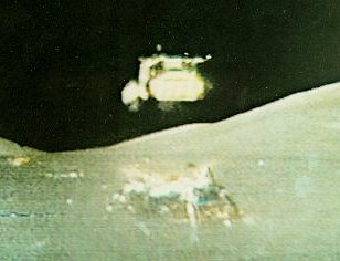 | A lonely Rover watches with its television eye as the last Apollo explorers depart from the Moon. |