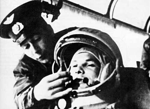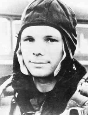 | The Russians were ahead. A month after the 184-pound Sputnik I, they sent up the dog Laika (above left) in the 1120-pound Sputnik II. Three years later, on April 12, 1961, Yuri Gagarin (above right and below) became the first man to orbit the Earth. His Vostok I's payload was 10,417 pounds and his flight lasted 108 minutes. At this time, the United States was in the final stage of preparing for its first manned suborbital flight, on May 5, 1961. The physical hazards of weightlessness were then almost wholly unknown. |
