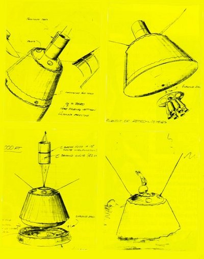 | Engineers brainstormed many ideas. These sketches illustrate some of them. In the upper left a spacecraft is shown still attached to its booster. It has jettisoned nose fairings and deployed its antenna. The drawing to the right of it shows the jettisoning of spent retrorockets as the spacecraft reenters the atmosphere. For reentry the blunt end is pointed in the direction of travel, thus serving as a heat shield. In the lower left sketch the heat shield is jettisoned just before splashdown. The final sketch shows the spacecraft floating safely in the water as an astronaut waves to the recovery team. Caldwell C. Johnson sketched these concepts in May 1958. |