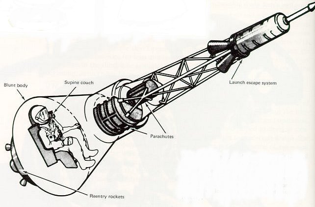 | Tests, redesigns, and more tests led to this basic configuration for manned spaceflight. A special escape system would pull the man from an exploding booster. Lying on a tailored couch, he would best withstand the g-loads of launch, abort, and atmospheric reentry. |