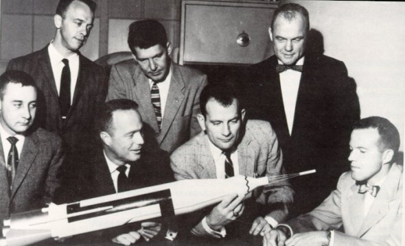 | The first seven American astronauts, chosen in April 1 959, were (from left, seated) Virgil I. Grissom, M. Scott Carpenter, Donald K. Slayton, and L. Gordon Cooper, Jr.; (standing) Alan B. Shepard, Jr., Walter M. Schirra, and John H. Glenn, Jr. They were test pilots who volunteered to fly a spacecraft -similar to the model shown- that had not yet been built. |