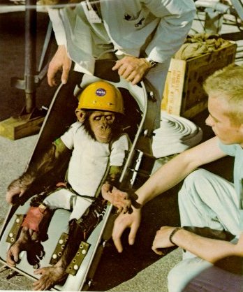 "Then, at 900.000 feet, you'll get the feeling that you must have a banana." (From Daily Mail, 23rd February 1960) Animals flew first, paving the way for man. Chimpanzees were physiologically manlike and easily trained. The Air Force's Aeromedical Field Laboratory provided them. |