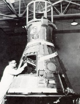 | Tiny one-man spacecraft -then called capsules- orbited the Earth in the Mercury program. They were checked out in a hangar at Cape Canaveral before being hoisted up and mated with a launch vehicle. Heat-resistant shingles covered the afterbody. |