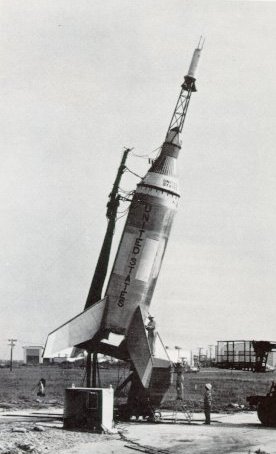 | Boiler plate models (below) of escape tower and spacecraft were tested with Little Joe boosters at Wallops Station. Little Joe could briefly deliver up to 250,000 pounds of thrust from eight solid-fuel rockets. These launches were in 1959 and 1960. |