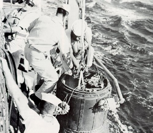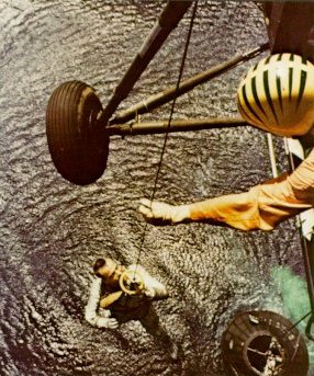 | The first suborbital spaceflight of Project Mercury ended happily when a U.S. Marine helicopter recovery team plucked astronaut Alan B. Shepard, Jr., out of the sea to fly him to the carrier Champlain on May 5, 1961. |