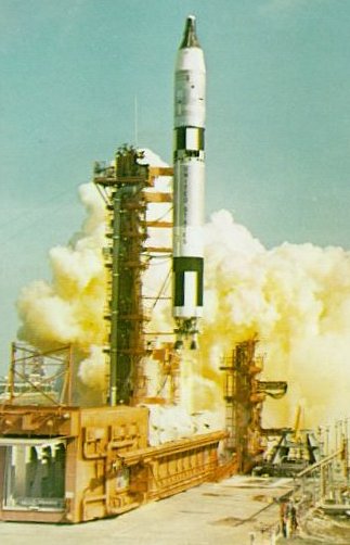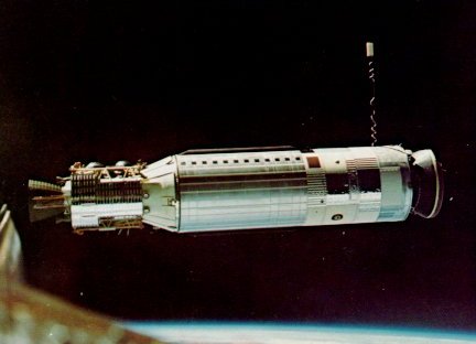 | An Agena target vehicle was docked with by Gemini VIll on March 16, 1966. A short-circuited thruster set the two craft spinning dangerously, forcing Astronauts Armstrong and Scott to end the mission. |