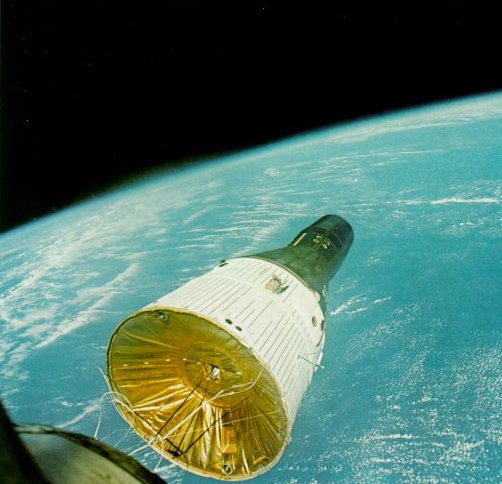 | First U.S. rendezvous in space occurred an December 15, 1965, when Gemini VI found and came within 6 feet of Gemini VIl, which had been launched 11 days earlier. Picture below was shot by Tom Stafford, aboard Gemini VI with Wolly Schirra. The other spacecraft, shown here at a range of 37 feet, was flown by astronauts Borman and Lovell in a flight lasting more than 330 hours. Rendezvous proved entirely feasible but tricky to manage with minimum fuel use. |