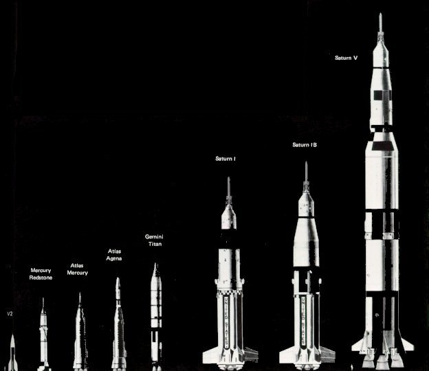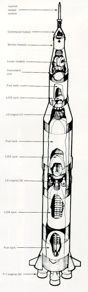 | The stack: the three-stage launch vehicle, Saturn V, surmounted by its payload, the Apollo spacecraft. The greater part of the launch vehicle consists of tankage for the fuel and for the oxidant, LOX (liquid oxygen), used in all three Saturn V stages. The powerful F-1 engines of the first stage burn kerosene to produce a combined thrust of 7.5 million pounds. The fuel for the J-2 engines of the two upper stages is liquid hydrogen. The combined thrust of the second stage's five engines is just over a million pounds, or five times that of the third stage's single J-2 engine. Development of the original hydrogen tanks was difficult because the low boiling point of hydrogen (-253 °C) required insulation sufficient to prevent transfer of heat from the outside and the comparatively warm (-183 °C) liquid oxygen. |