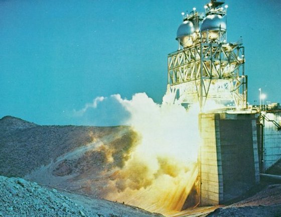 | Thunder echoed in the mountains when a mighty F-1 engine spoke out during qualification. At a remote high-thrust test complex near Edwards, Calif., fuel and LOX were pumped in and tons of water cascaded over the flame deflector while elaborate instrumentation measured the behavior of each new engine. It wasn't flightworthy if it didn't match specs. |