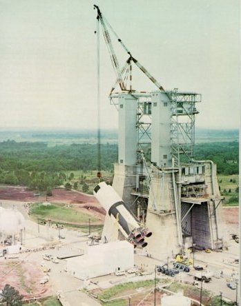 | The first (S-IC) stage of the Saturn V launch vehicle being hoisted into the static test stand at Marshall Space Flight Center. This was the "battleship," or developmental test version of the stage, built heavily to permit repeated testing of flight-version working components. The first three flight S-IC stages were assembled at MSFC and tested in this stand. The massively reinforced construction of the 300-foot-tall stand was essential to withstand the 7.5 million pounds of thrust developed by the stage's engines during static testing. |