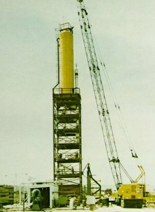 | The "pogo problem," a lengthwise mode of vibration recognized in the second Saturn V launch, was speedily solved through mathematical analysis supported by data collected in shake tests. To supplement shake tests in Marshall's Dynamic Test Tower, Boeing quickly erected this tower for special pressure tests at the Michoud Assembly Facility. |