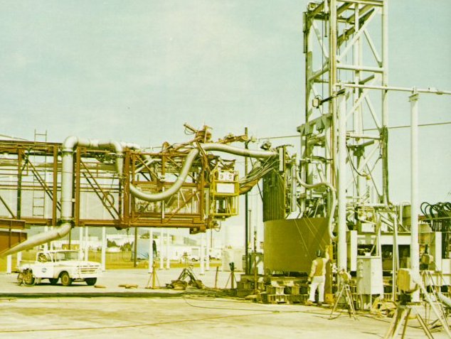 | A test at the "Arm Farm". Just to the man's left a skin section representing the S-11 stage is mounted to the Random Motion/Lift-Off Simulator, which can simulate at ground level the swaying of the space vehicle in a Florida storm. A duplicate of the Mobile Launch Tower's S-11 Forward Swingarm projects from the left, carrying the umbilicals that are connected to the skin section. |