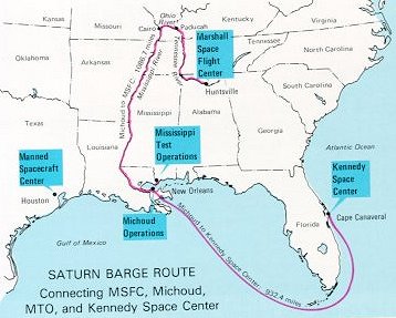 | Bulky but fragile, huge launch-vehicle stages could not travel by rail or public road; tunnels, bridges, and low wires would have dictated endless detours. Right, even a comparatively small Saturn I wasn't easy to back into its barge at Huntsville. Below, a rocket-laden barge is escorted by two tugs through Sun-bronzed waters. The biggest California-built parts of Saturn V voyaged by ship through the Panama Canal and across the Gulf of Mexico. |