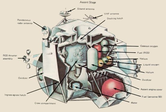 | The lunar module was also a two-part spacecraft. Its lower or descent stage had the landing gear and engines and fuel needed for the landing. When the LM blasted off the Moon, the descent stage served as the launching pad for its companion ascent stage, which was also home for the two explorers on the surface. In function if not in looks the LM was like the CM, full of gear to communicate, navigate, and rendezvous. But it also had its own propulsion system, an engine to lift it off the Moon and send it on a course toward the command module orbiting above. |