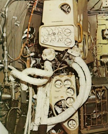 | Like a plumber's dream, the LM's environmental control system nestled in a corner of the ascent stage. Those hoses provided pure oxygen to two astronauts at a pressure one-third that of normal atmosphere, and at a comfortable temperature. The unit recirculated the gas, scrubbed out CO2 and moisture exhaled, and replenished oxygen as it was used up. |