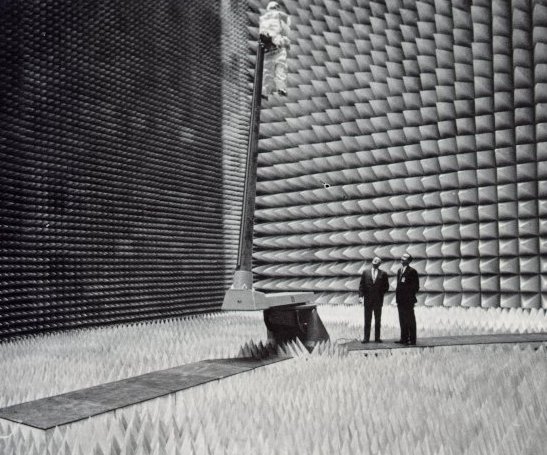 | Sound is deadened and not an echo can be heard in this anechoic test chamber. Used to simulate reflection-free space, its floor, walls, and ceiling are completely covered with foam pyramids that absorb stray radiation, so that an antenna's patterns can be accurately measured. Here two NASA engineers inspect a test setup of an astronaut's backpack. Any interference between the astronaut and his small antenna could be detected and fixed before a real astronaut set foot on the Moon. |