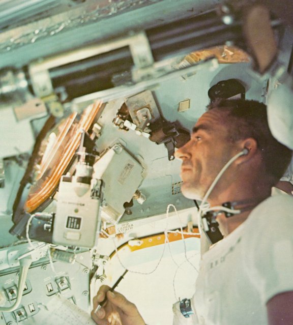 | Like new Magellans, astronauts learned to navigate in space. Here Walt Cunningham makes his observations through a spacecraft window. The tools of a space navigator included a sextant to sight on the stars, a gyroscopically stabilized platform to hold a constant reference in space, and a computer to link the data and make the most complex and precise calculations. |