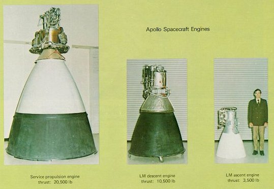 | Similar in shape but not size were the three big engines aboard Apollo spacecraft. Two of them had no backup, so they were designed to be the most reliable engines ever built. lf the service-propulsion engine failed in lunar orbit, three astronauts would be unable to return home; if the ascent engine failed on the Moon, it would leave two explorers stranded. (A descent-engine failure would not be as critical, because the ascent engine might be used to save the crew members.) |