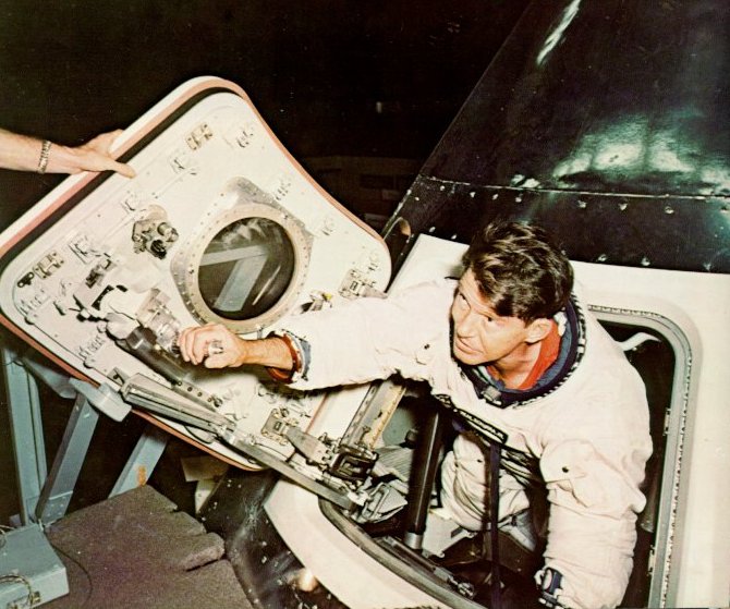 | Inspecting the new hatch, Wally Schirra makes sure his crew cannot be trapped as was the crew that died in the terrible Apollo spacecraft fire. Opening outward (to swing freely if pressure built up inside), the new hatch had to be much sturdier than the old inward-opening one. The complicated latch sealed against tiny leaks but allowed very rapid release. |
