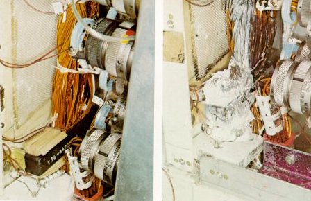 | After the fire, flammability and self-extinguishment were key concerns. In the test setup at right a wiring bundle is purposely ignited, using the white flammable material within the coil near the bottom to simulate a short circuit (left). Picture at right shows the aftermath: a fire that initially propagated but soon extinguished itself. It took great effort and ingenuity to devise materials that would not burn violently in the pure-oxygen atmosphere. lf a test was not satisfactory and a fire did not put itself out, the material or wire routing was redesigned and then retested. |