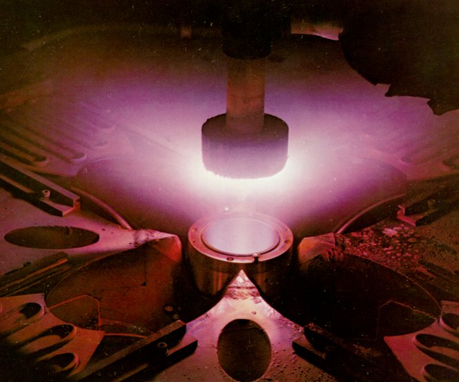 | Seared at temperatures hotter than the surface of the Sun, a sample of heat-shield material survives the blast from a space-age furnace. Machines used to check out Apollo components were as demanding as those in the mission itself, because a mistake or miscalibration during preflight trials could easily lay the groundwork for disaster out in unforgiving space. |