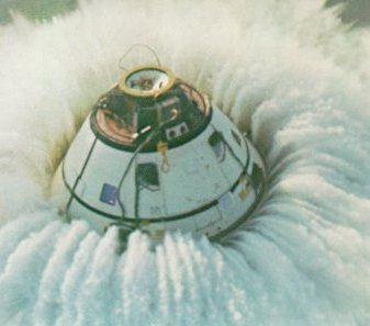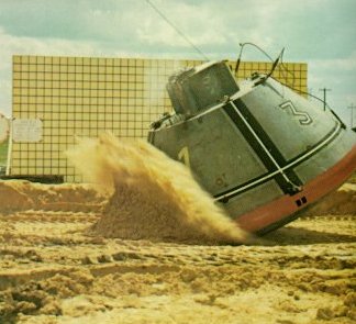 | Meant to fly in a vacuum, and to survive fiery reentry, the command module had also to serve as a boat. Although its parachutes appeared to lower it gently, its final impact velocity was still a jarring 20 mph. Tests like this one established its resistance to the mechanical and thermal shocks of impact, and its ability to float afterward. |