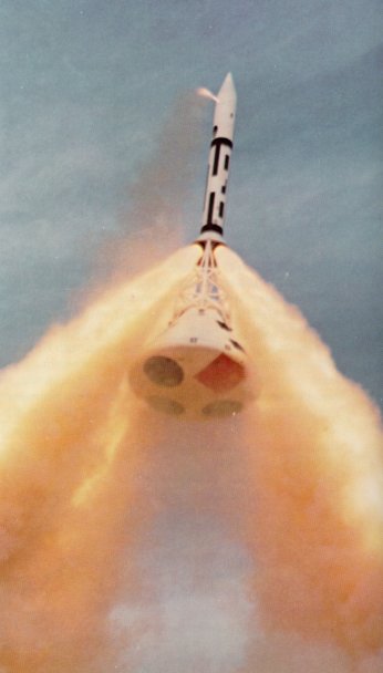 | Up and away goes the command module, when the solid-fuel escape rocket - a single rocket firing through three nozzles - lights off. The sequence is begun only when the booster has accelerated the command module to "worst-case" speeds and heights. As it happened, the escape system was never needed during any of the Apollo launches. |