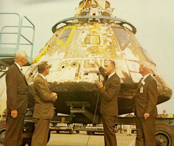 | Charred but perfectly intact, the CM here had passed its most severe test of reentry at a speed of 25,000 mph. From left, Ralph Ruud, Dale Myers, George Low, and Robert Gilruth. |