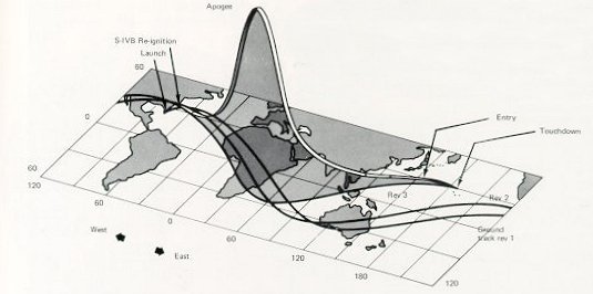 | This is the flight path of the Apollo 4 spacecraft above during its trial. First, its booster carried it to its peak altitude, and then its own big rocket accelerated it down into the atmosphere until it reached reentry speed. To an observer it would have appeared like a giant meteorite in the sky. |