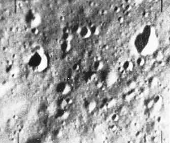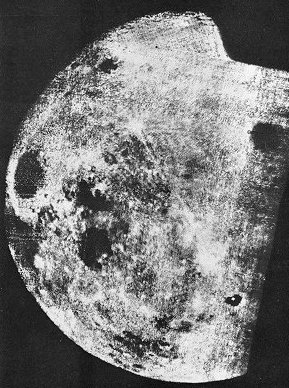 | Mankind's first glimpse of the far side of the Moon came in October 1959, provided by the Soviet spacecraft Luna 3. Although crude compared with later views, its pictures showed a number of lunar features for the first time. One of these was the crater Tsiolkovsky, named for the famed Russian mathematician, which appears here in the lower right as a small sea with an island in it. The images from Luna 3 indicated that the Moon's far side lacked the large mare areas an the side facing Earth. |