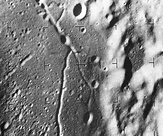| The last instant before it srnashed, Ranger IX radioed back this historic image, taken at a spacecraft altitude of one-third mile about a quarter of a second before impact. The area pictured is about 200 by 240 feet, and details about one foot in size are shown. The Ranger pictures revealed nothing that discouraged Apollo planners, although they did indicate that choosing an ideally smooth site for a manned landing was not going to be an easy task. |