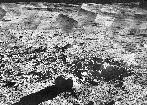 | The rolling highlands north of Tycho are portrayed with remarkable clarity in this mosaic assembled from among Surveyor VII's 21,038 photographs. To estimate scale, the boulder in the foreground is 2 feet across, the crater about 5 feet wide, and the far hills and ravines some 8 miles distant. |