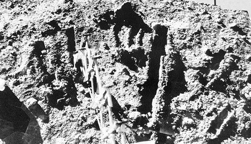 | Surveyor VII's "garden" was a heavily worked-over area next to the spacecraft. Trenches were dug with the articulated scoop to give data on the mechanical properties of the surface. At left is the alpha-backscattering instrument that provided accurate measurements of the chemical composition of the surface. |