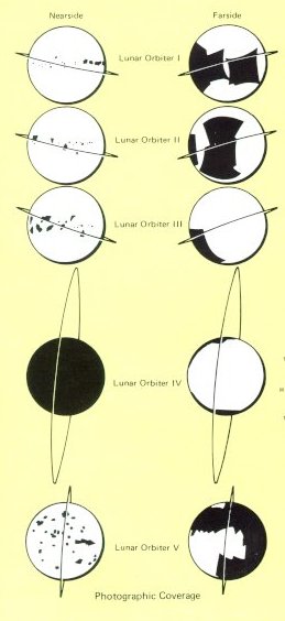 | Lunar Orbiter was planned for use in conjunction with Surveyor; one spacecraft class was to sample the surface of the Moon, and the other was to map potential Apollo landing sites. Five Orbiters were flown, so successfully that they returned not only precision stereo-photography of all contemplated landing areas but also photographed virtually the entire Moon, including the far side. Included in the photographs returned were the landed Surveyor I, the impact crater caused by Ranger VIII, and many breathtaking images of high scientific value. Orbiter coverage is shown at the left. |