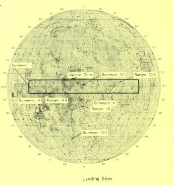 | The equatorial Apollo landing zone with its precursor Ranger and Surveyor landing sites. |