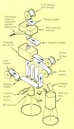 | It was in its photo system that Orbiter was most unconventional. Other spacecraft took TV images and sent them back to Earth as electrical signals. Orbiter took photographs, developed them on board, and then scanned them with a special photoelectric system - a method that, for all its complications and limitations, could produce images of exceptional quality. One Orbiter camera could resolve details as small as 3 feet from an altitude of 30 nautical miles. A sample complication exacted by this performance: because slow film had to be used (because of risk of radiation fogging), slow shutter speeds were also needed. This meant that, to prevent blurring from spacecraft motion, a velocity-height sensor had to insure that the film was moved a tiny, precise, and compensatory amount during the instant of exposure. |