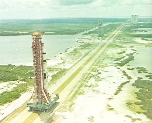 | The first Saturn V space vehicle and its Mobile Launcher on their way out to Launch Pad A atop a transporter. The pad is 3 1/2 miles east of the VAB. The Mobile Service Structure is parked at the loop where the crawlerway to Pad B diverges to the north (right). The barge canal to the VAB runs parallel to the main crawlerway. |