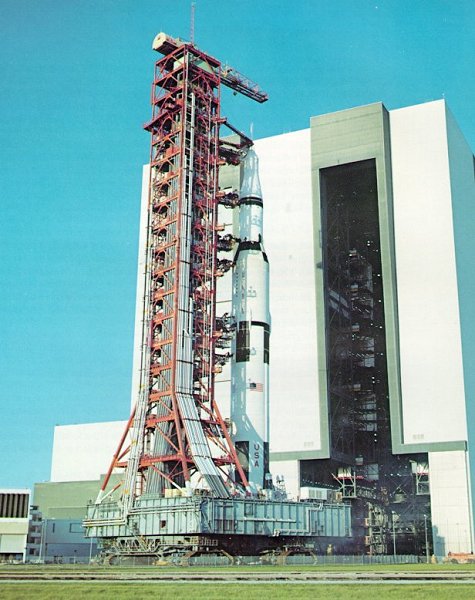 | The last Moonbound Apollo-Saturn rolls slowly out of the huge VAB into the morning Sun. Each door of the four VAB bays opens 456 feet high and 75 feet wide. The VAB encloses a volume of 129,482,000 cubic feet. But the tale that clouds form inside and rain falls is only folklore. |