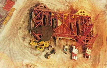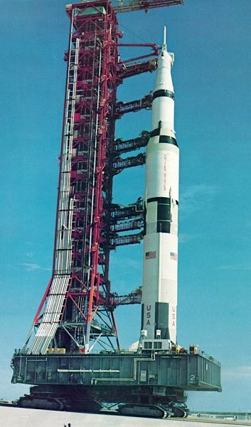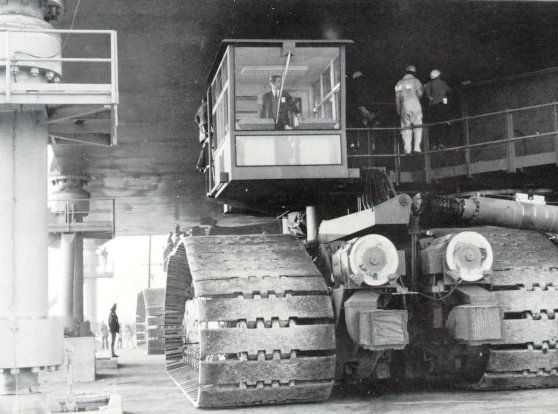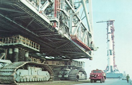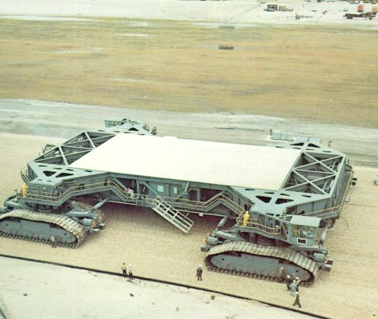 | Mining technology for a Moon launch. Utilizing power shovel design concepts, two 131-foot long, 3000-ton, track-mounted crawlers were built to transport the MSS and an assembled Apollo-Saturn V from the VAB to the pad, and back should hurricane weather threaten a launch. |