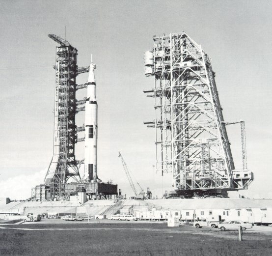 | Dress rehearsal. During a Countdown Demonstration Test, as for an actual Apollo launch, the Mobile Service Structure was removed from the pad at about T-minus-11 hours, leaving the fueled space vehicle in place. The MSS owes its awkward shape to the many platforms built out over the base of the Mobile Launcher to service the rocket. The designers then balanced the MSS by placing the elevators and their machinery at the other side of the structure. |