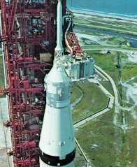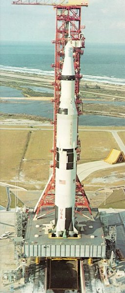 | Getting set for the flames of an Apollo launch. The thrust chambers of the first stage's five engines extend into the 45-foot-square hole in the Mobile Launcher platform. Until liftoff, the flames will impinge downward onto a flame deflector that diverts the blast lengthwise in the flame trench. Here, a flame deflector coated with a black ceramic is in place below the opening, while a yellow (uncoated) spare deflector rests on its track in the background. It takes a tremendous flow of water (28,000 gollons per minute) to cool the flame deflector and trench. The pumps, which start 8 seconds before ignition, can deliver that flow for 30 seconds, and then a reduced flow for an indefinite period. Another 17,000 gpm of water curtains the Mobile Launcher tower from the rising flames. |