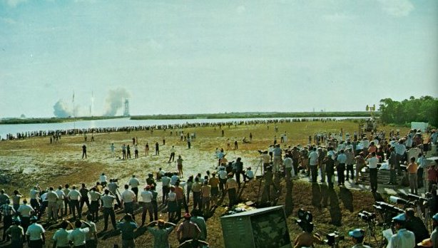 | Apollo 11 lifting off the pad on July 16, 1969, the culmination of years of intense activity at the Cape. In this wide-angle view from the press site, all eyes squint in the direction of the hot morning Sun and the distant Launch Pad 39A, where the exhaust gases of the rocket's first stage have been split by the flame deflector into two distinct columns of flame and smoke. |