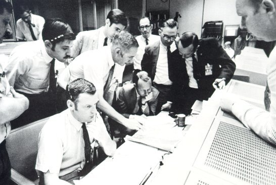 | During the Apollo 13 crisis the Mission Control directors discussed possible landing recovery options. Because of the unique configuration (the LM still attached to the CM) new procedures leading to reentry were developed. Ten phone lines were open between Mission Control and experts at the Grumman plant. Engineers in Downey, Calif., where Odyssey was built, ran emergency problems through Computers and at MIT a team worked through the night on the guidance system and prepared new trajectories. Perseverance and ingenuity were rewarded with a safe landing in the Pacific less than 4 miles from the USS Iwo Jima. |