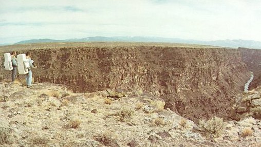| Standing at the rim of the Rio Grande gorge near Taos, N. Mex., Apollo 15 astronauts Jim Irwin and Dave Scott see a landscape remarkably like the one they visited at the Hadley Rille landing site on the Moon. Each Astronaut team participated in a series of geology field trips to acquaint them with the kinds of field observation that would be most useful to lunar scientists, the types of rock specimen they should particularly try to sample, and the special problems in working with their equipment on the general terrain they would encounter. |