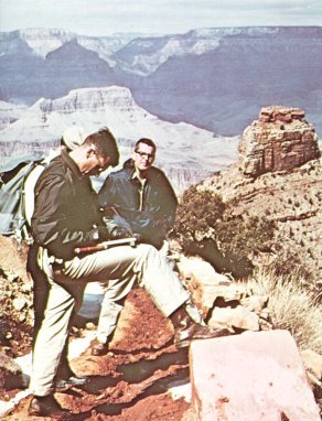 | Astronauts and their instructor take notes on their field observations during a geology training trip into the Grand Canyon, in Arizona. Although the rocks that are exposed at the Grand Canyon do not resemble lunar rocks in any way, the trip here was an important step in familiarizing the astronauts with the basics of geology, so that they could function well as observers and collectors. |